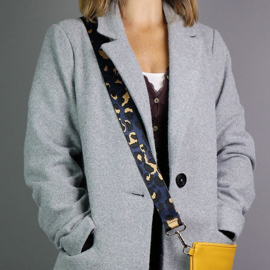 Update your best loved bag or personalise a new one with this eye catching navy and tan mix leopard print nylon bag strap. The strap is interchangeable/removable and can be adjusted for use with a shorter shoulder bag or a longer cross body. It can be easily attached to any bag with a D-ring attachment. The strap width is 1.5 inches approx. A perfect gift for bag lovers.