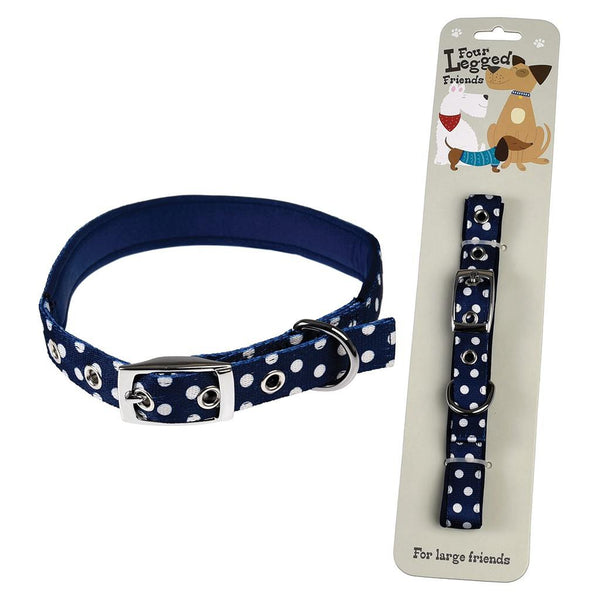 Treat your four legged friend to a classic blue polka dot dog collar. Perfect for male and female dogs, this collar is also available for small and medium dogs!