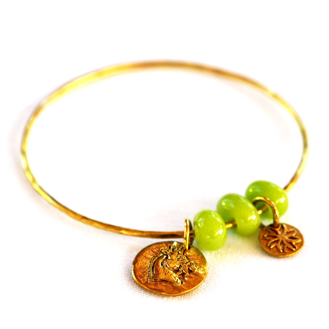 This handmade fair trade brass bangle has a large double sided brass charm with a horse and an elephant and lime green recycled glass.