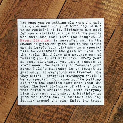 An original birthday card featuring lots of quotes about birthdays. In a striking black and red design this typographic card features fun and heartfelt phrases such as...